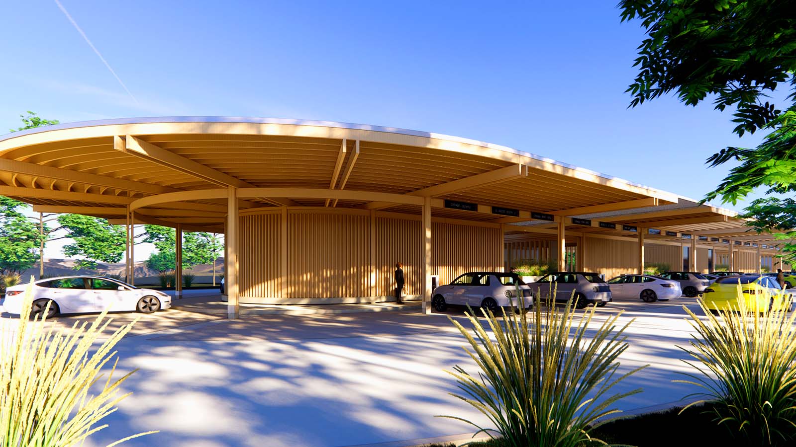 Seu design propõe uma longa estrutura linear com terminais de carregamento em todo seu perímetro. No centro, ele abriga lojas e outros serviços de conveniência, além de espaços não comerciais para que motoristas possam fazer uma pausa e relaxar.