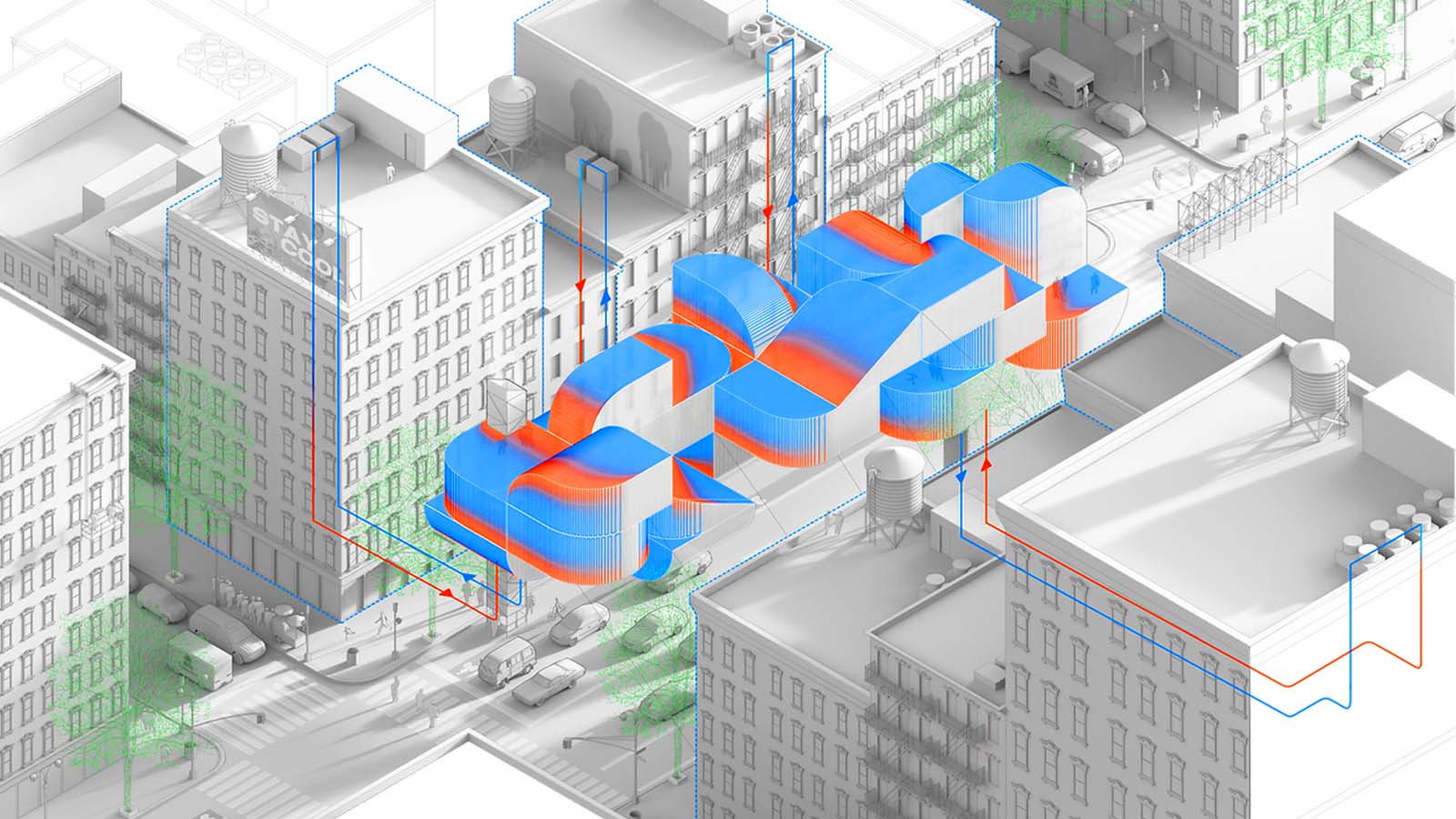 As árvores, é claro, fornecem esse tipo de sombra de maneira bastante eficaz, mas o Oversky pretende criar espaços de sombra ainda maiores e mais eficientes. As representações iniciais que Tjeldflaat fez desse conceito mostram que ele cobre apenas uma parte do espaço entre os edifícios, de modo a não barrar completamente a passagem do sol para pedestres e moradores.