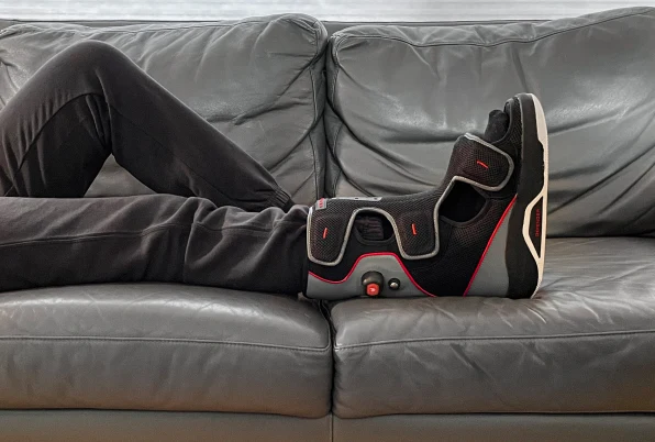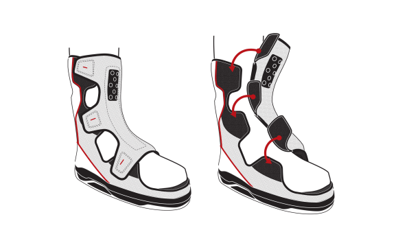 Com essa nova abordagem, as partes duras moldadas por injeção entraram na constituição interna do sapato, enquanto uma camada externa, mais macia, as esconde. Fica parecendo um tênis de cano alto normal, como tantos outros. Foi adicionada a sola plana de um sapato de skate, para manter o pé plano. Mas ela foi misturada com um padrão de “espinha de peixe” na parte inferior, para ajudar na tração - a mesma abordagem adotada em tênis de basquete.