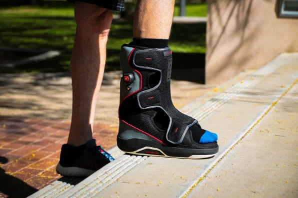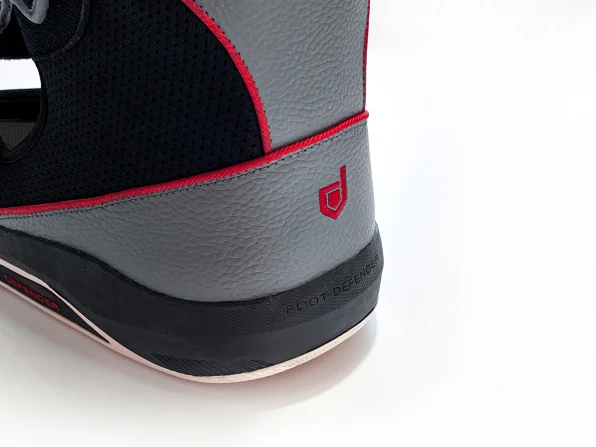 Para apoiar também a perna e o calcanhar, uma grande concha moldada por injeção foi adicionada dentro do Foot Defender, como uma bota de esqui. “Ele fica travado no tornozelo para que você não consiga de jeito nenhum se inclinar para frente”, diz DiTullo. “Na frente [na língua da bota] há fibra de carbono moldada, que impede a pessoa de projetar os joelhos para frente de modo a forçar os dedos dos pés.”