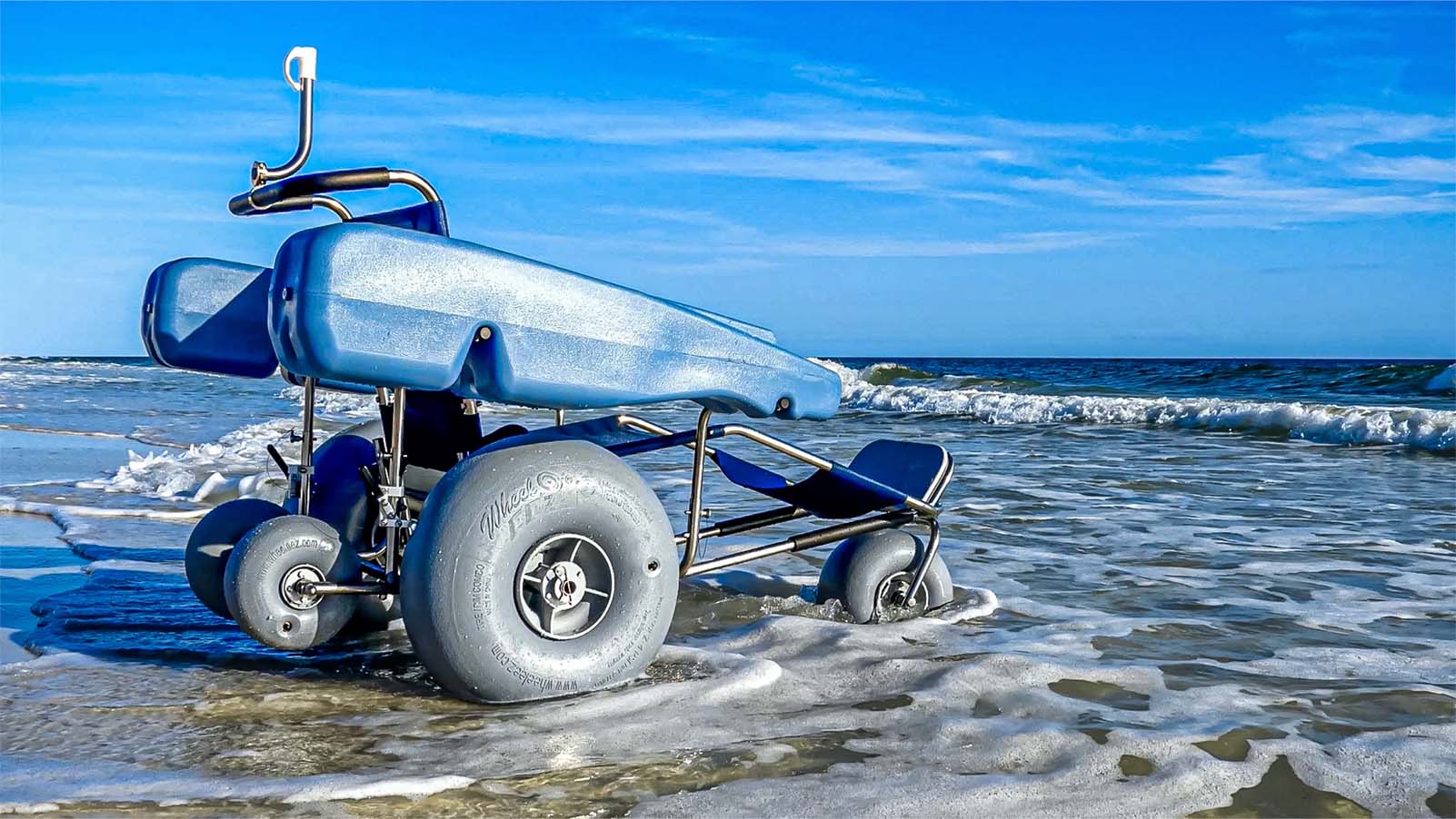 Hoje, várias empresas fabricam cadeiras de rodas para praia como essa, como a francesa Vipamat e a norte-americana Wheeleez. No entanto, nos anos 1990, as opções eram bastante limitadas.