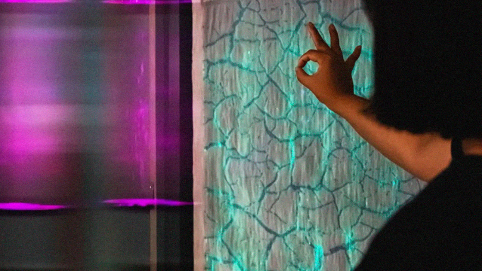 Mas se você levantar o polegar na frente de um dos painéis, eles mudarão de azul para verde. Se erguer os braços acima da cabeça, as luzes mudam para amarelo.