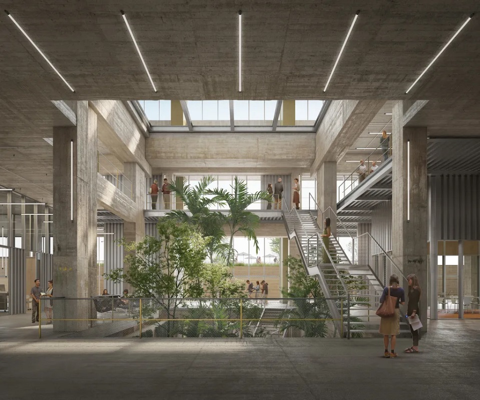 Os andares inferiores, mais fechados, vão abrigar incubadoras e salas de exposição. Já os níveis superiores, com ampla vista para o mar, serão destinados a salas de formação e laboratórios de pesquisa.