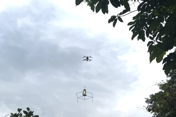 Drones equipados com sistemas de coleta de três tipos de amostras para análise de DNA ambiental (eDNA): um para amostras de água, outro para coletar amostras de vegetação (pairando a quase 15 metros de altura, acima das copas das árvores) e um terceiro drone com dispositivos para aspirar o ar e coletar eDNA.