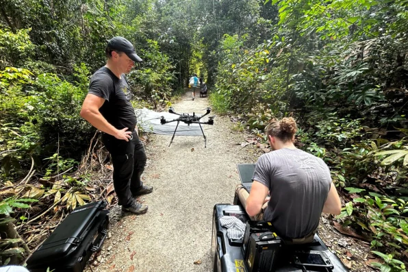 Um drone com câmeras RGB e hiperespectrais (que analisam um espectro de luz mais amplo do que as câmeras tradicionais), além de sensores LiDAR para mapear a floresta. A equipe também usa dois drones menores equipados com gravadores de áudio para voar abaixo das copas das árvores e registrar o som de insetos e pássaros.
