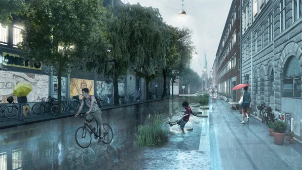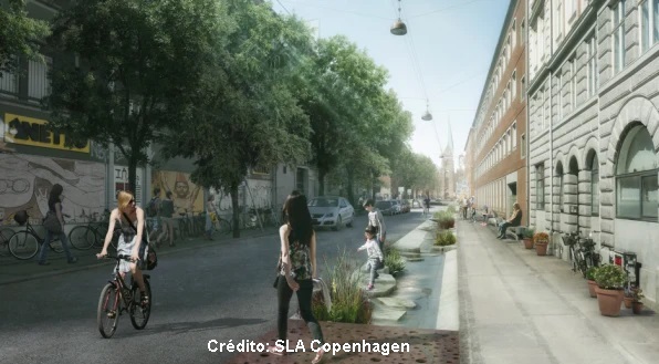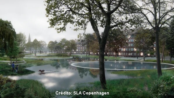Em Copenhague, na Dinamarca, um projeto está construindo reservatórios em um parque da cidade – em áreas que as pessoas podem usar quando não está chovendo – e um novo canal que levará água para os lagos da região. Em ruas próximas, os jardins de chuva ajudam a absorver a água para evitar a sobrecarga do sistema de esgoto. Em outros bairros, jardins rebaixados armazenam água da chuva.