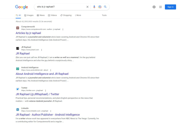 Isso cria uma experiência muito diferente. Por exemplo, quando pesquiso no Google meu próprio nome, aparece uma lista simples de resultados – começando com o meu perfil no Computerworld, um site para o qual escrevo, e depois meu blog e outras fontes.
