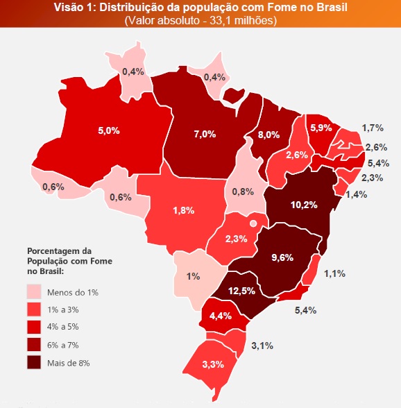 O estudo identificou que a fome afeta 33,1 milhões de brasileiros (16% da população), principalmente nos estados de São Paulo e Bahia (com aproximadamente 23% do total). Amazonas (39%) e Maranhão (37%) apresentam os maiores percentuais em relação à população do estado (os dados são de 2022).