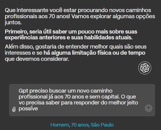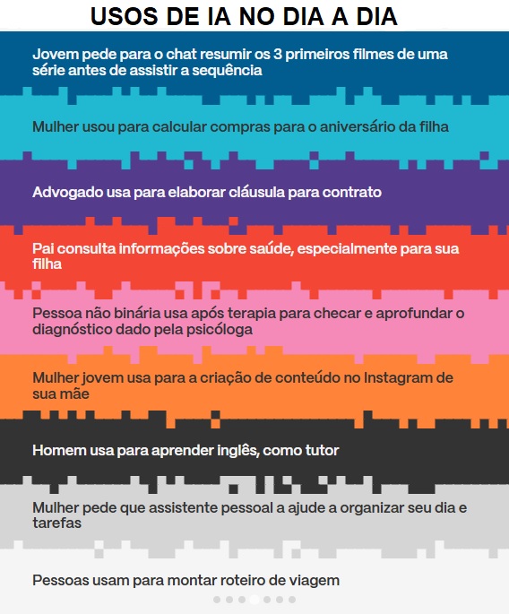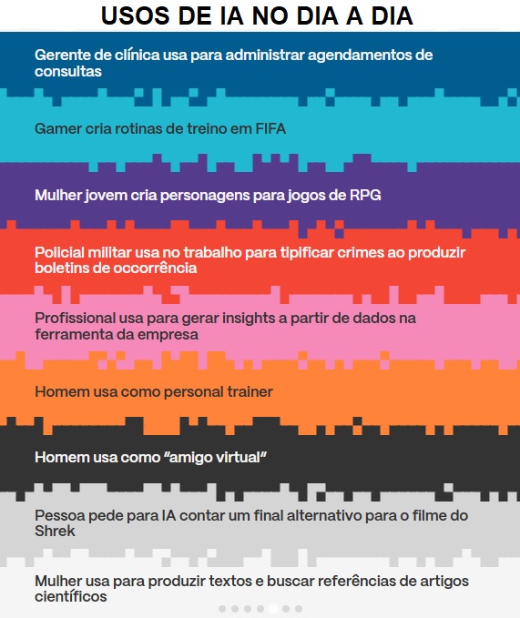 A pesquisa traz histórias de personagens que usaram a IA como uma parceira na tomada de decisão. Em uma delas, uma jovem se aconselha com a IA para fazer uma dieta. Acabou recorrendo a um médico depois de ficar desnutrida. Em outro caso, um senhor de 70 anos usou a ferramenta na busca de emprego. Aceitou a sugestão de virar corretor e já tinha vendido dois imóveis.